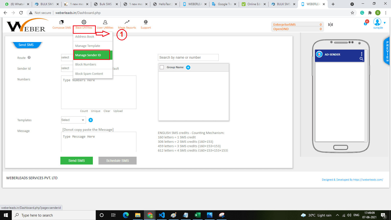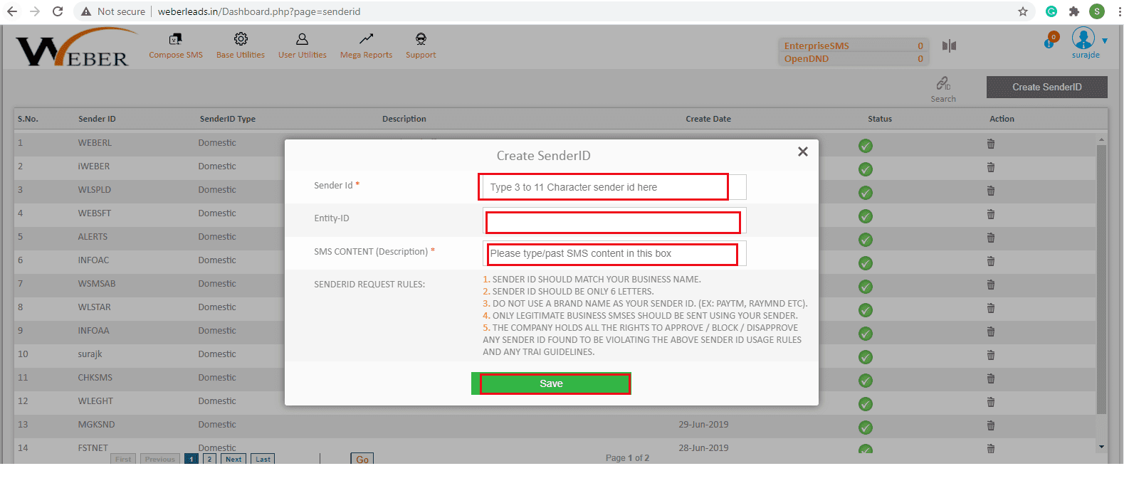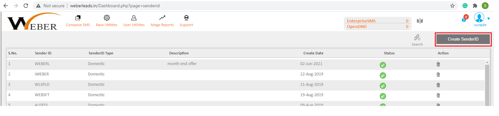 To Create sender ID in weberleads.in click on base utility then click on Manage Sender-ID