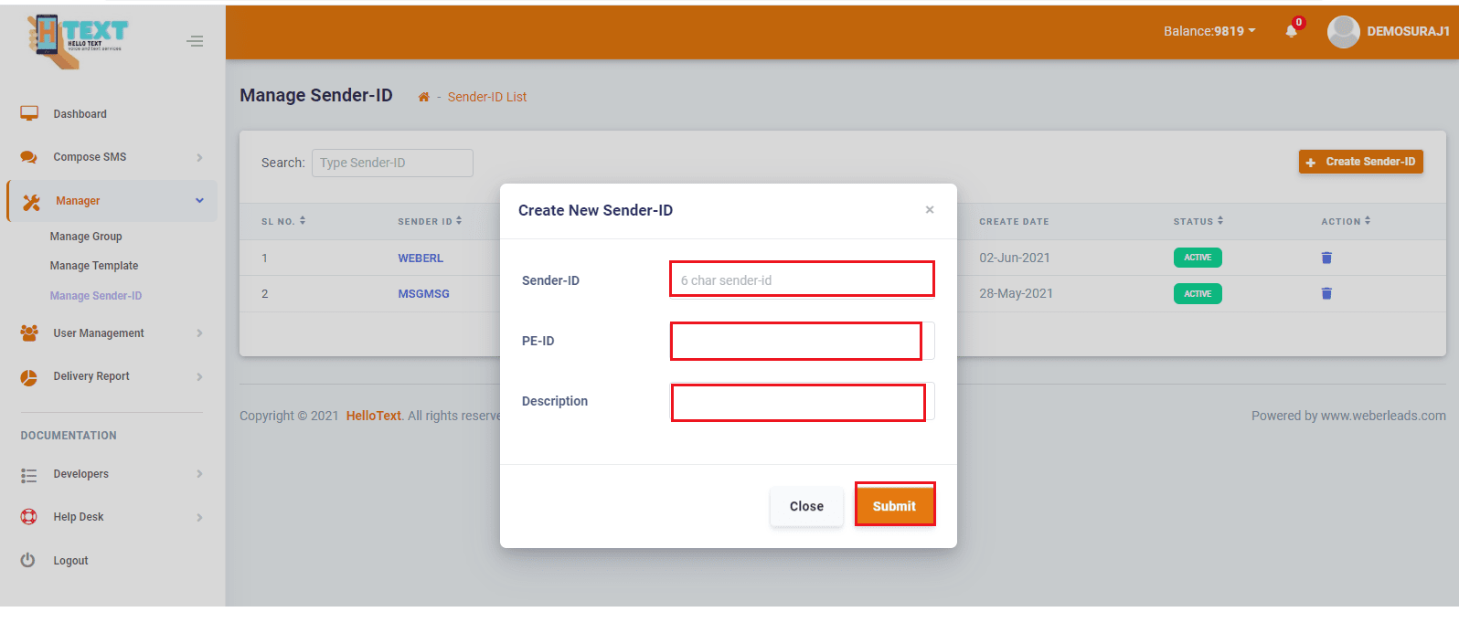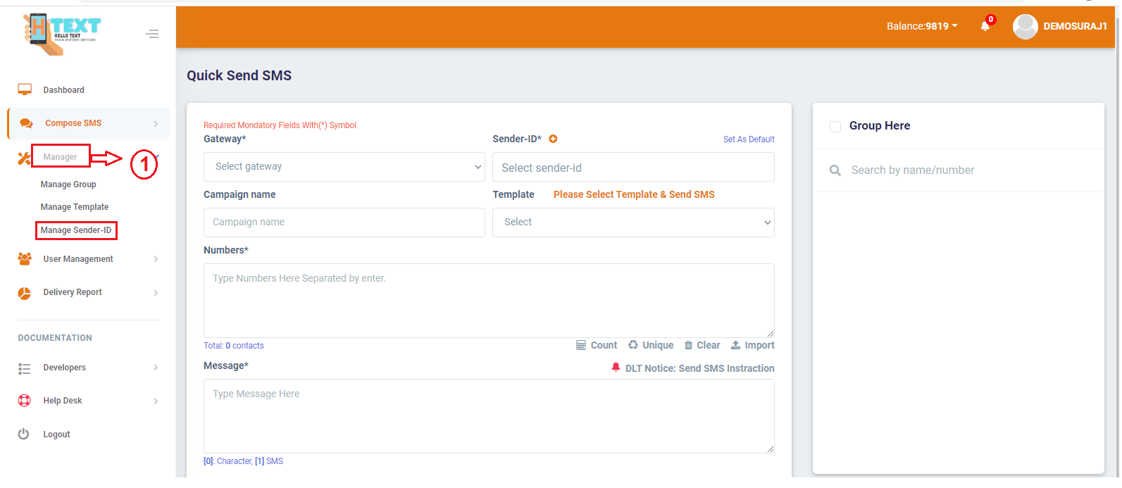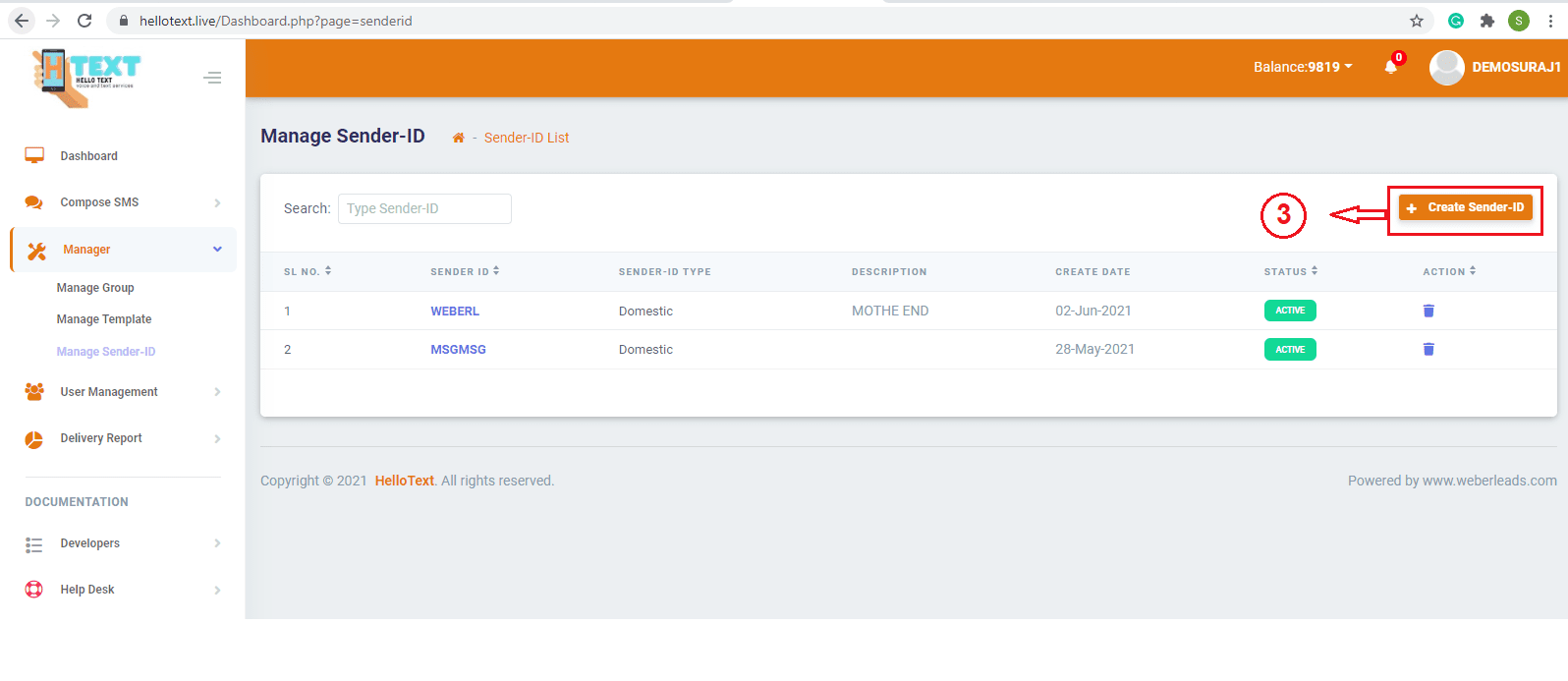 To Create sender ID in hellotext.live click on Manager then click on Manage Sender-ID