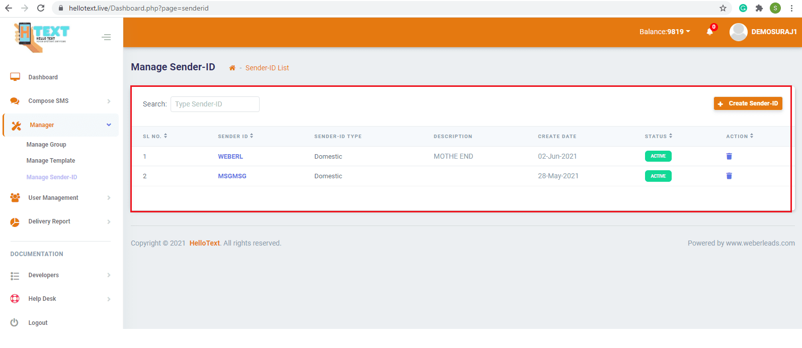 After clicking on Manage Sender-ID you will be redirect on this page then click on create sender ID button on the top right side