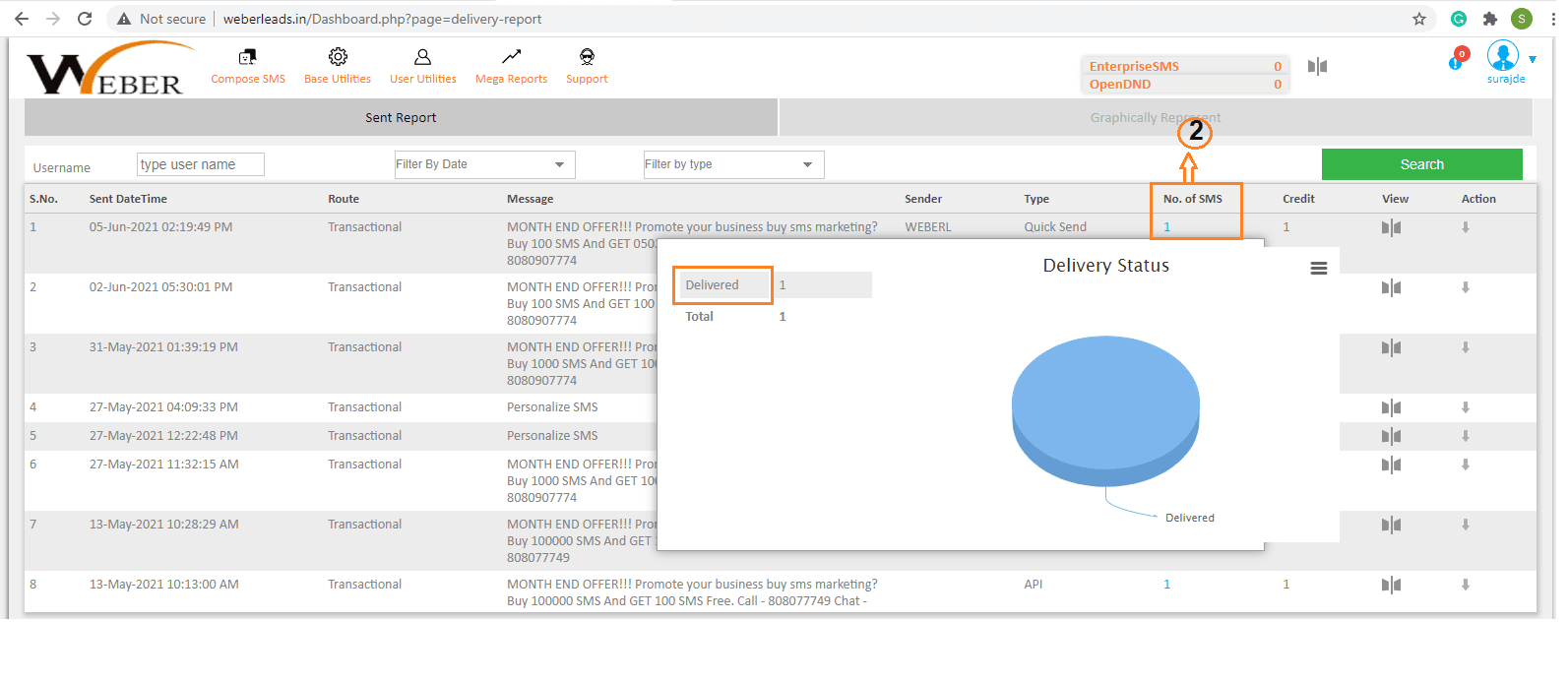 2. If you want to check the delivery report of the particular number then go to column number 7 then click on Number
