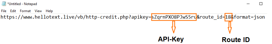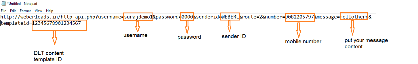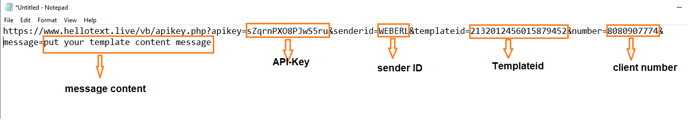 After Puting API-Key on Notepad you have to put All Mandatory Parameters Like API-Key, sender ID, Templateid, mobile number AND message.