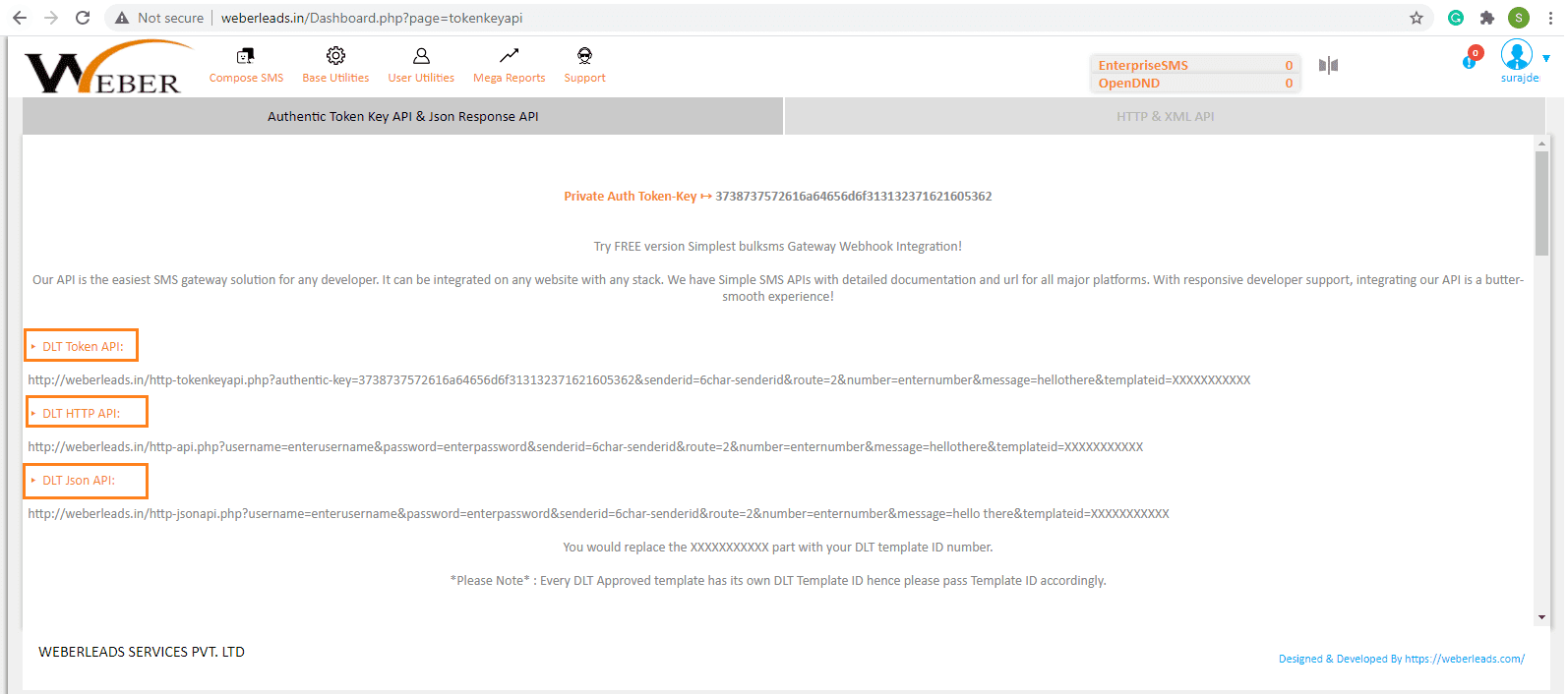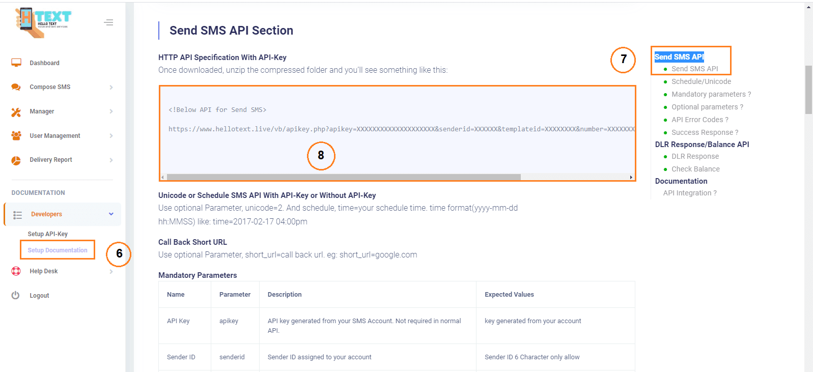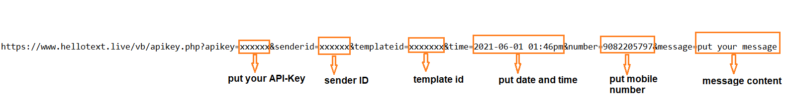 API Key, Sender ID, DLT Template-ID, Mobile number, Message