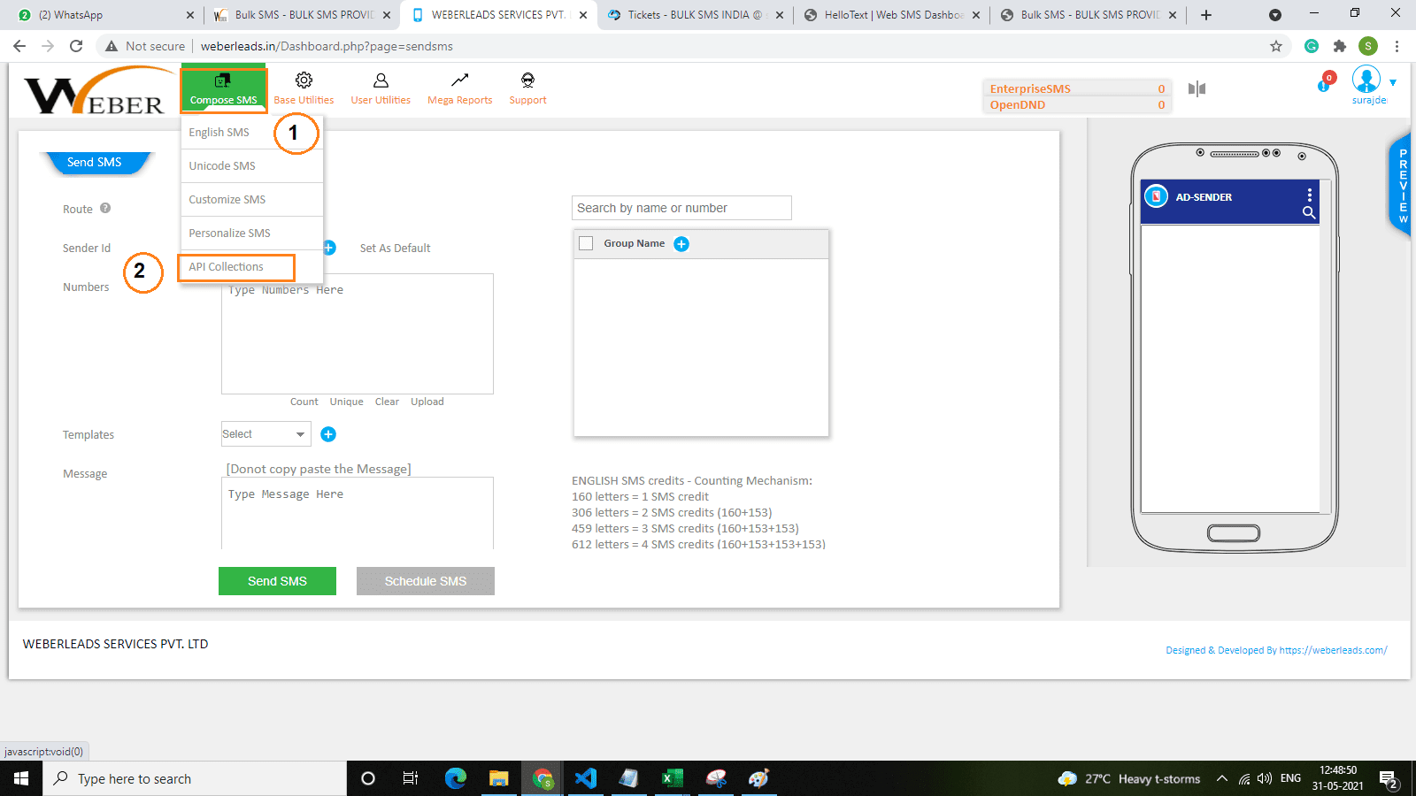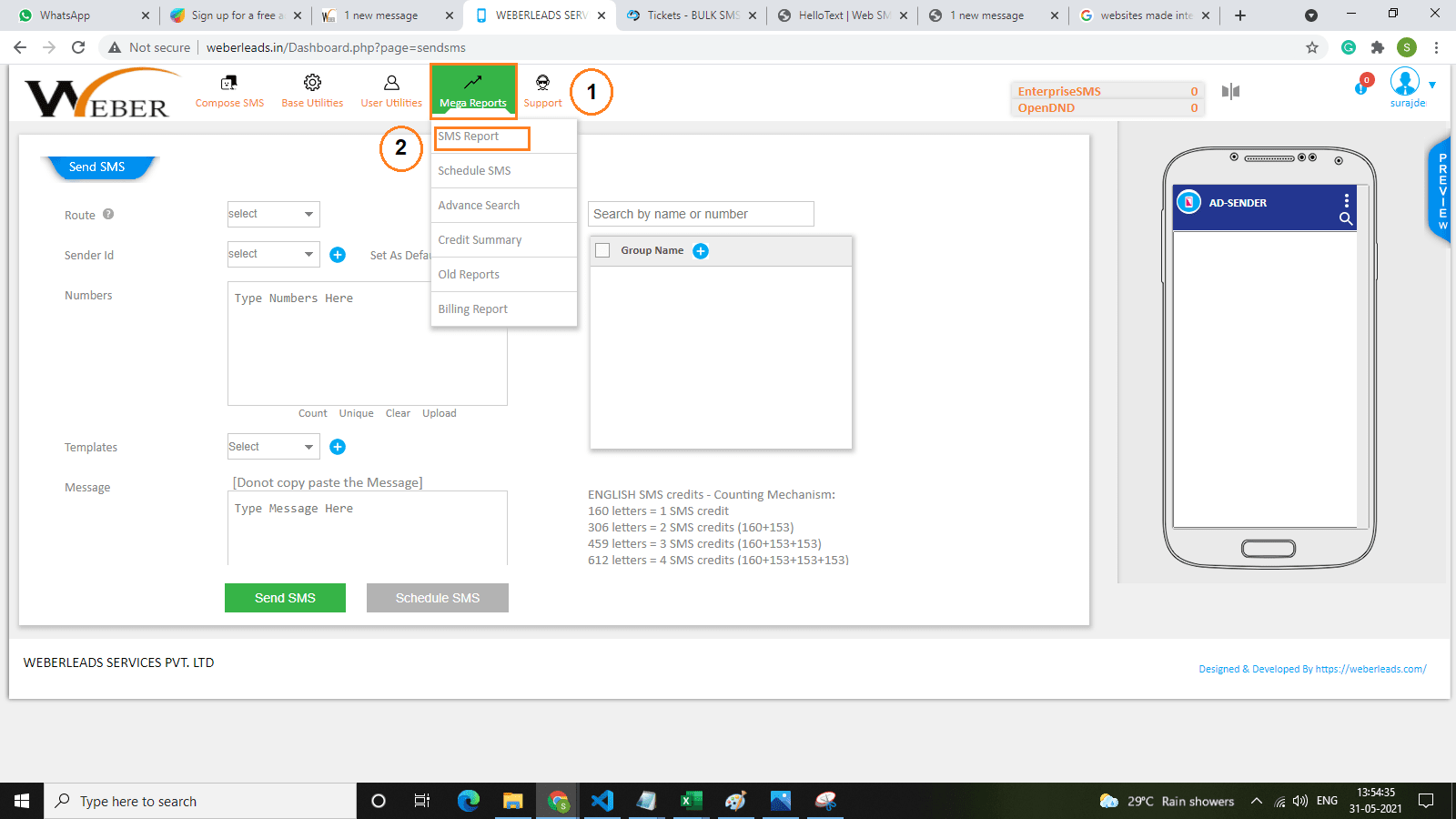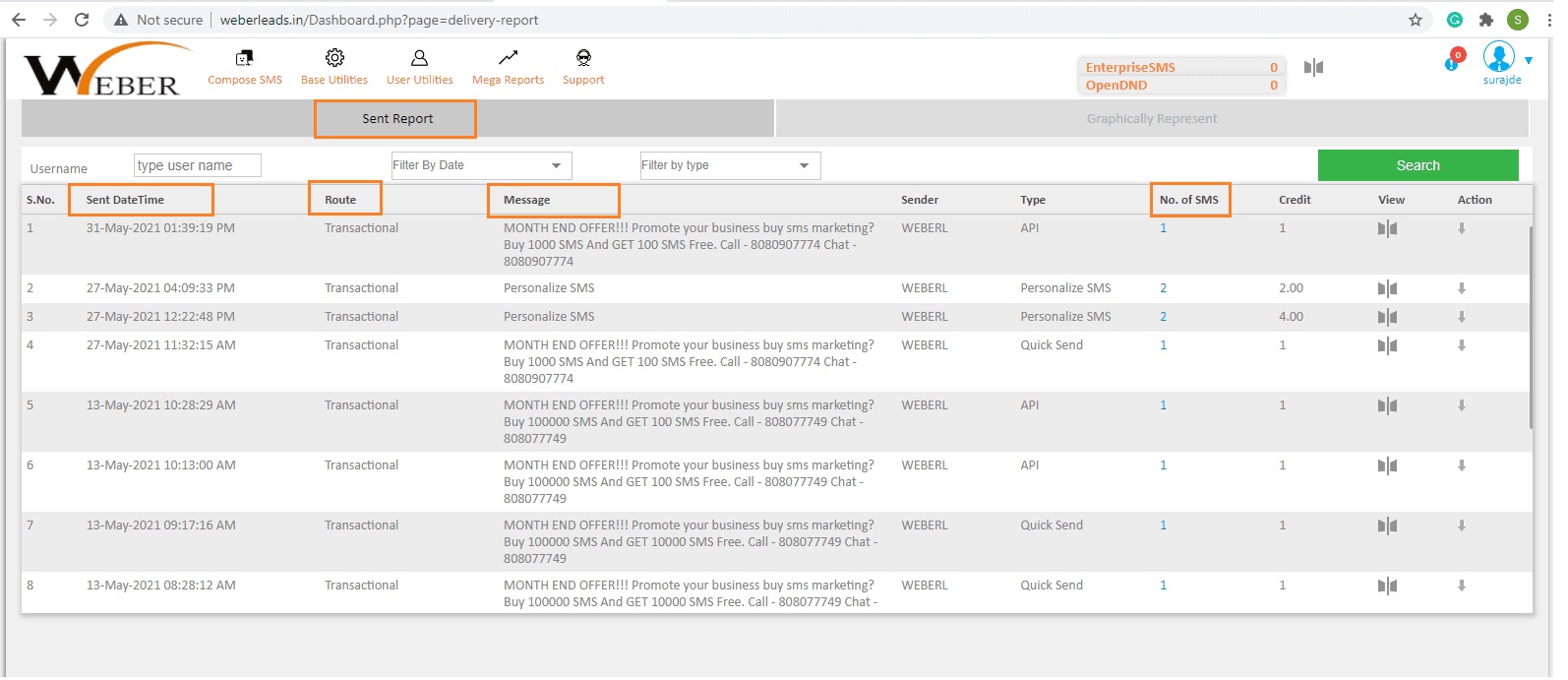 After sending SMS from weberleads.in to check SMS delivery report click on Mega Reports