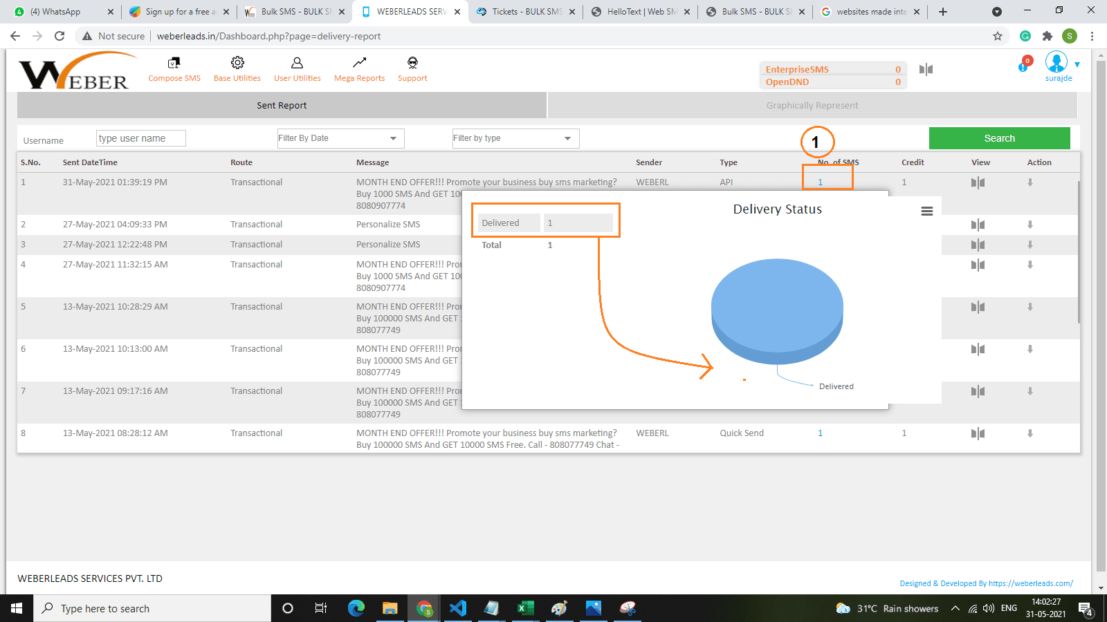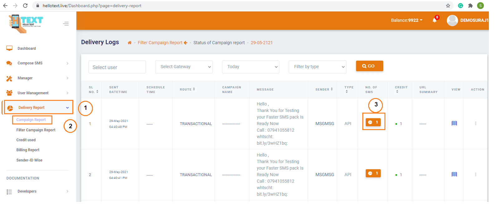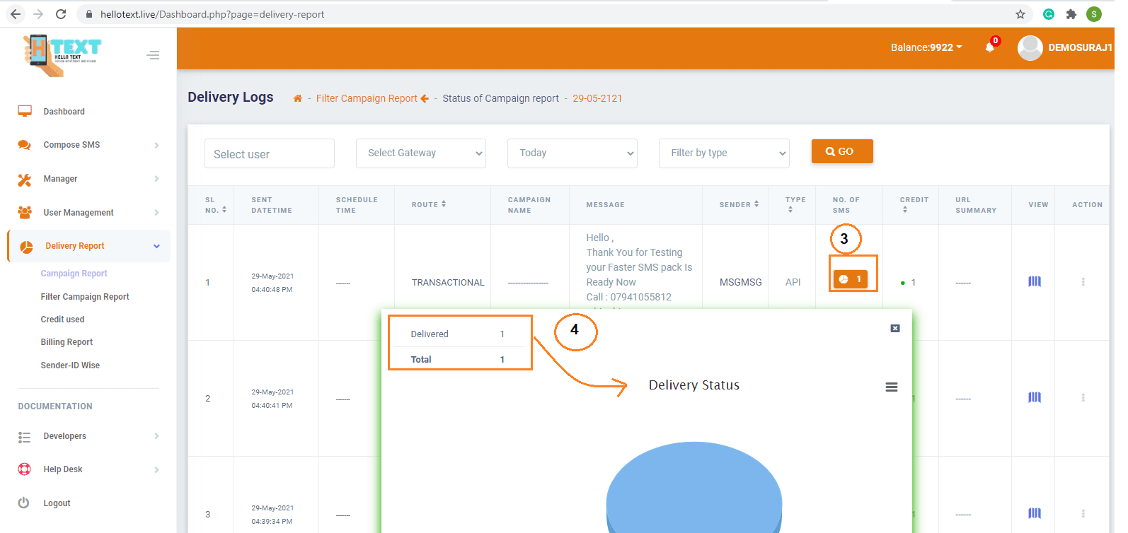 To check the delivery report click on Delivery Report, then click on Campaign Report then click on NO. OF SMS Icon