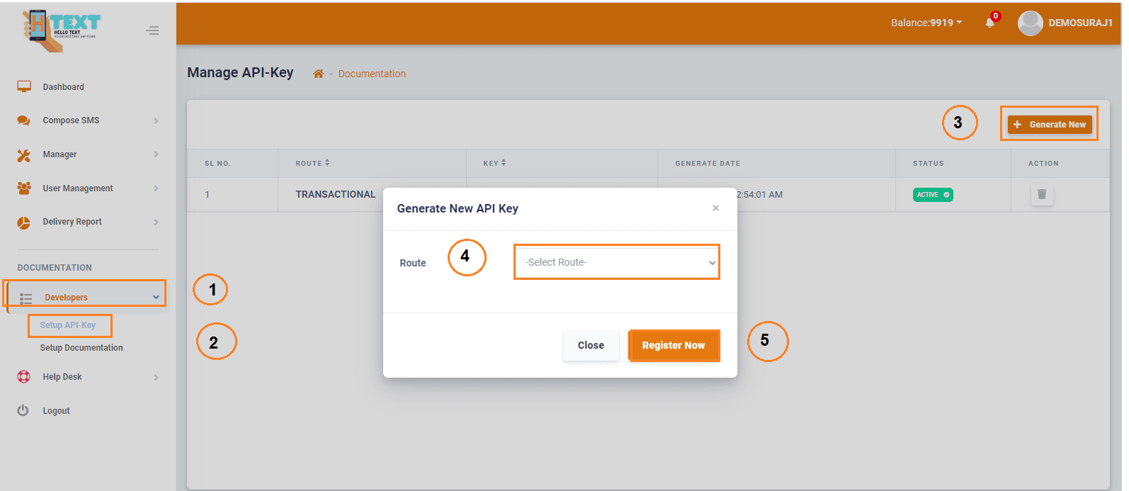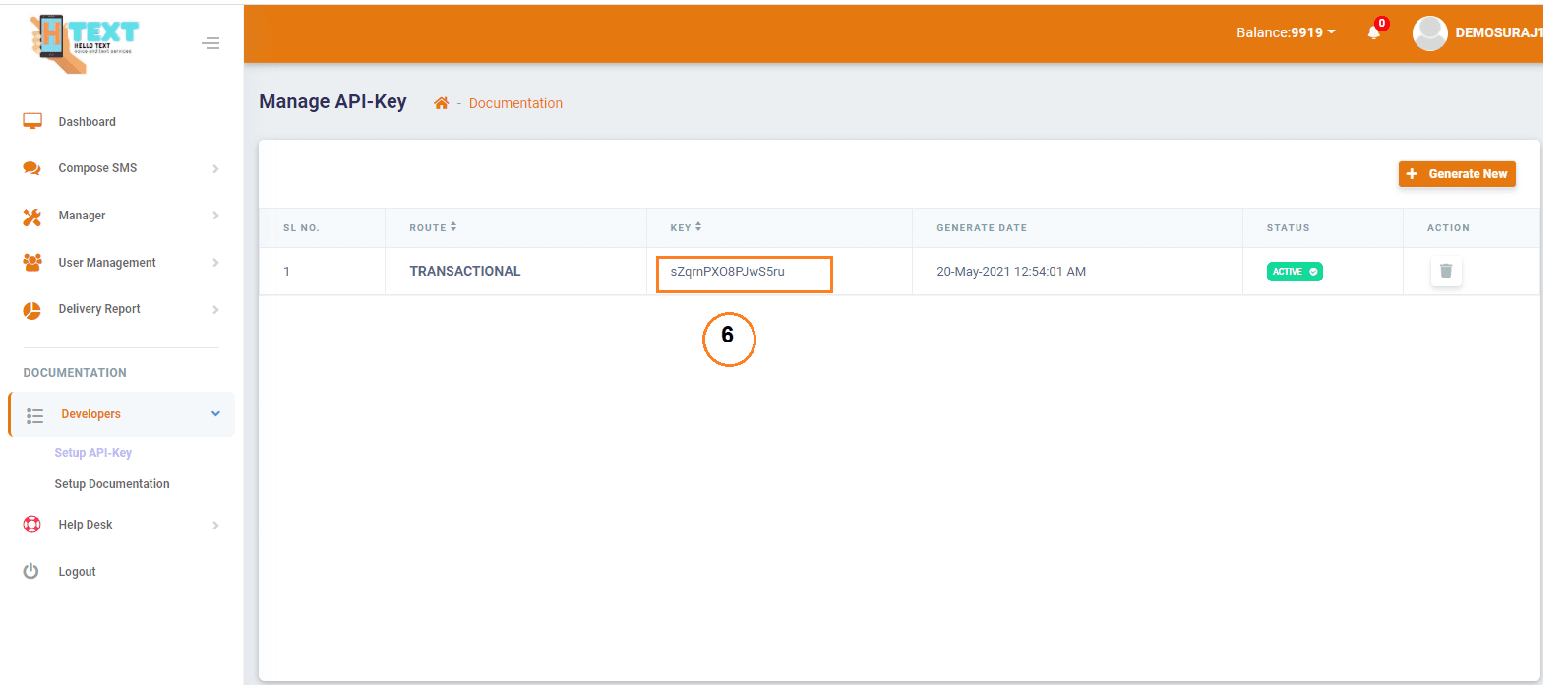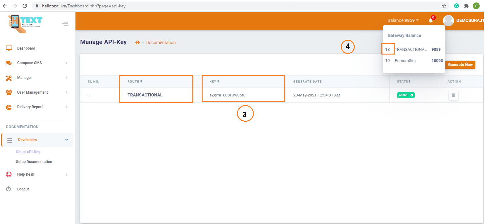 After creating API-key then click on Setup Documentation then go on top right side Click on Send SMS API then select API link and copy put on Notepad.